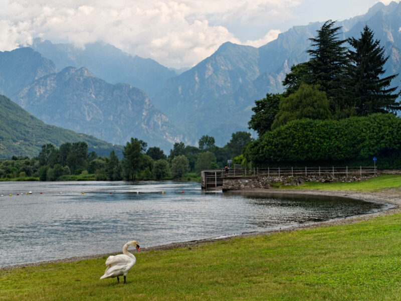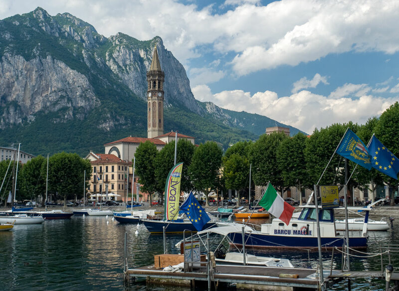 Le port de Lecco avec, à l'arrière-plan, le campanile de la Basilique San Nicolò.