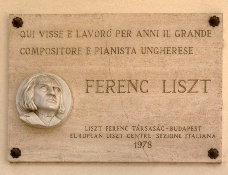 Villa d'Este "Ici vécut et travailla pendant de nombreuses années, le grand compositeur et pianiste hongrois Franz Liszt". Franz Liszt y composa Giochi d'Acqua a Villa d'Este (Jeux d'Eau à Villa d'Este) et y donna, en 1879, l'un de ses derniers concerts.