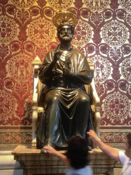 Basilique Saint-Pierre - la statue de bronze de Saint-Pierre avec les clés du paradis, attribuée à Arnolfo di Cambio. Les pèlerins la vénèrent en lui embrassant ou en lui frottant le pied.