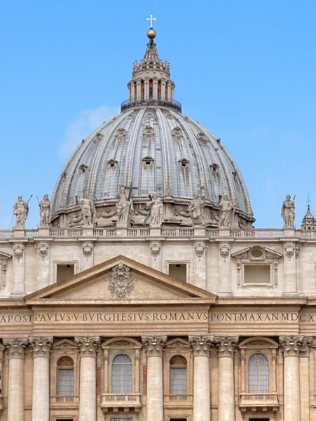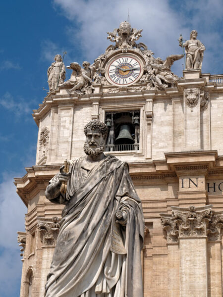 Basilique Saint-Pierre : l'horloge monumentale et la fenêtre des cloches. Au premier plan la statue de Saint-Pierre.